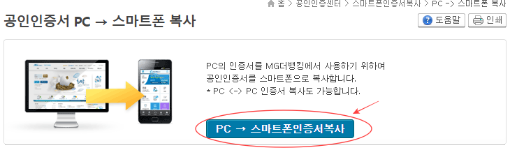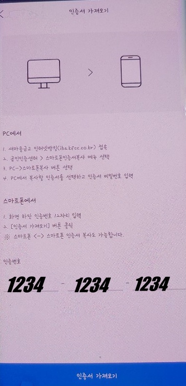 새마을금고 인증센터 홈페이지에서 왼쪽아래에서 PC->스마트폰 복사를 클릭하고 PC->스마스트폰인증서복사를 한번더 클릭해 주시면 발급받은 인증서의 목록이 뜹니다. 스마트폰에 옮기고 싶은 인증서를 클릭후 인증서의 비밀번호를 입력해 주면 인증서 내보내기 창에 뜨는 인증번호를 스마트 폰에 입력해주면 스마트폰에 복사가 완료됩니다.