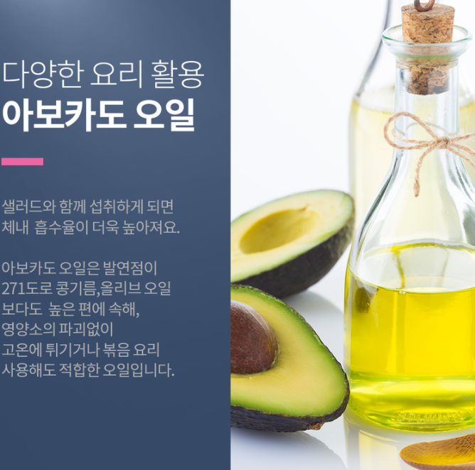 - 아보카도 오일 1스푼이면 아보카도 100g의 불포화지방산을 섭취하는 것과 같은 효과