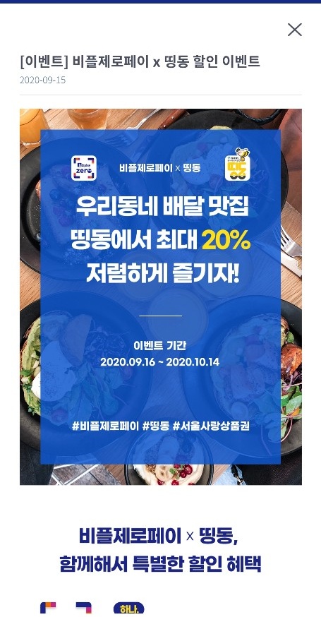 마지막으로 요즘 배달음식들 많이 시켜드시나요? 저는 많이 시켜먹는 편인데 제로페이에서 모바일상품권 구매하고 띵동앱을 설치 후 제로페이로 결제하면 10%로를 더 할인해준다니 정말 좋은 것같습니다! 예산소진시 조기종료된다니 얼른 한번 사용해 봐야겠습니다.