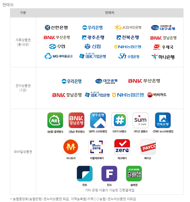 온라인에서 사용가능한 전자상품권은 7곳의 은행에서 구매가능하고 모바일상품권은 원하시는 어플이나 사용하고계신 어플에서 구매 가능합니다.