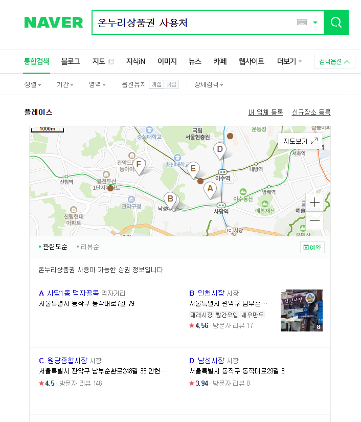 온누리상품권의 사용처는 전통시장이나 가맹상점가 등이 있는습니다. 그래도 무작정나가서 찾아보는 것보단 미리알고 가면 더 좋을것 같습니다. 그래서 사용처를 미리 알 수있는 방법을 몇가지 알아봤습니다. 우선 제일 간단한 방법은 인터넷 검색창에 온누리상품권 사용처라고 검색을 해주는 것입니다. 그럼 아래의 사진처럼 내주변 지역에 온누리상품권 사용처가 나옵니다.