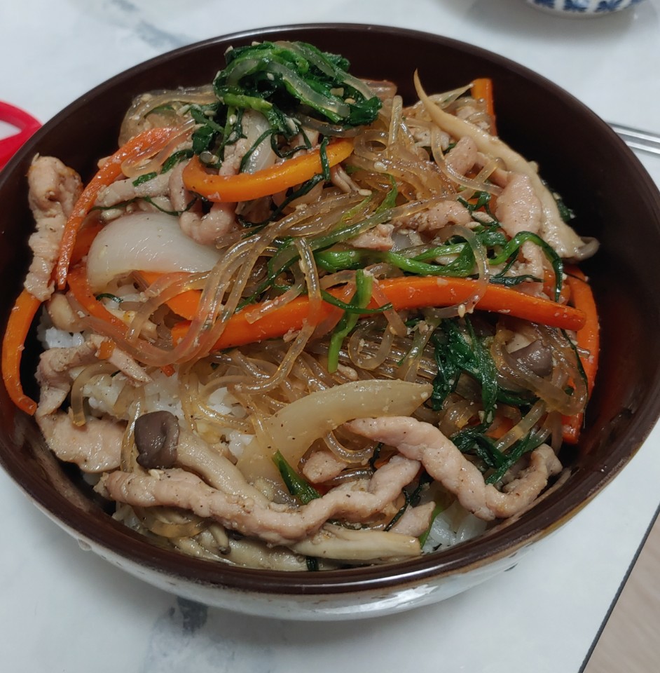 그러면 잡채 만들기 완성! 잡채는 만들기 어려운 음식으로 알려져 있지만 재료손질만 하면 금방 만들 수있는거 같아요. 취향에 따라서 재료를 더 넣어 만드시고 간장으로 간을 잡아주시면 맛있게드실 수있습니다. 처음만들어본 저도 어렵지 않게 만들 수있었어요.