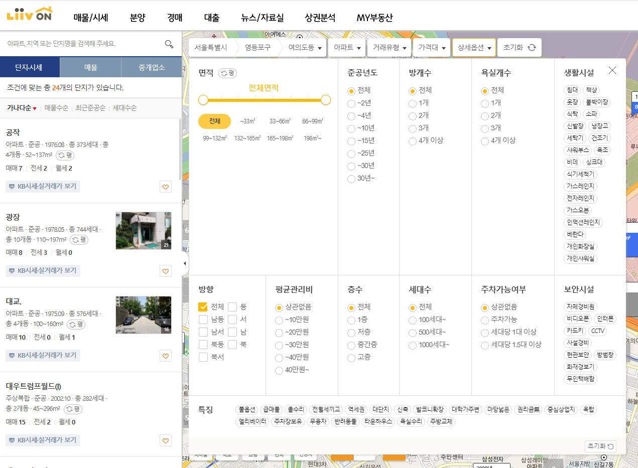 또 지도를 지도에서도 주소를 검색하거나 매물종류, 거래유형, 가격대를 설정할 수있고, 상세옵션에는 면적이나 준공년도 방개수, 욕실개수, 세대수, 주차가능 여부, 보안시설이나 생활시설까지도 설정하여 검색하실 수있습니다.