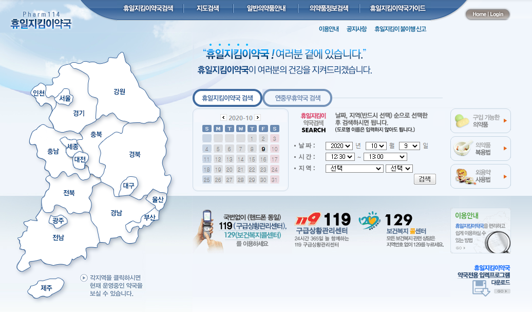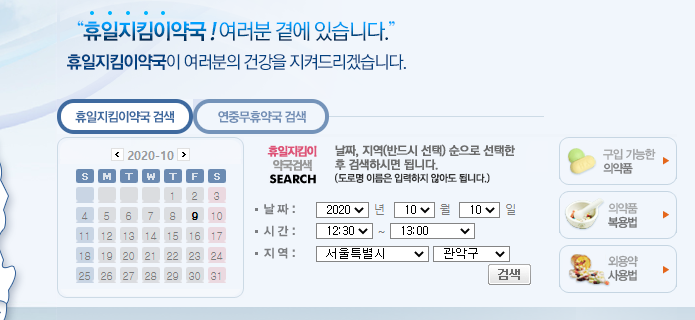 또 휴일지킴이약국 홈페이지에선 휴일약국을 검색하는 것말고 의약품 복용법이나 외용약 사용법이나 보건복지콜센터 번호도 안내하고있고 처방전없이 살 수있는 의약품등의 서비스도 있습니다.