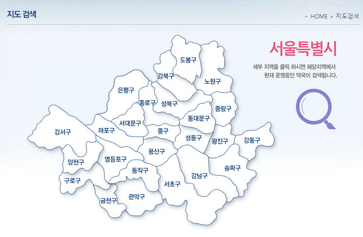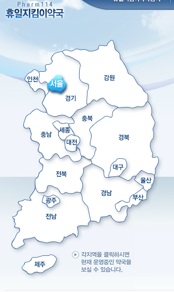 지도에서 원하는 지역을 선택하시면 그 지역의 세부지역이 나옵니다. 자신이 살고 있는 지역의 세부지역을 누르시면 휴일에 영업중인 약국이 뜹니다.