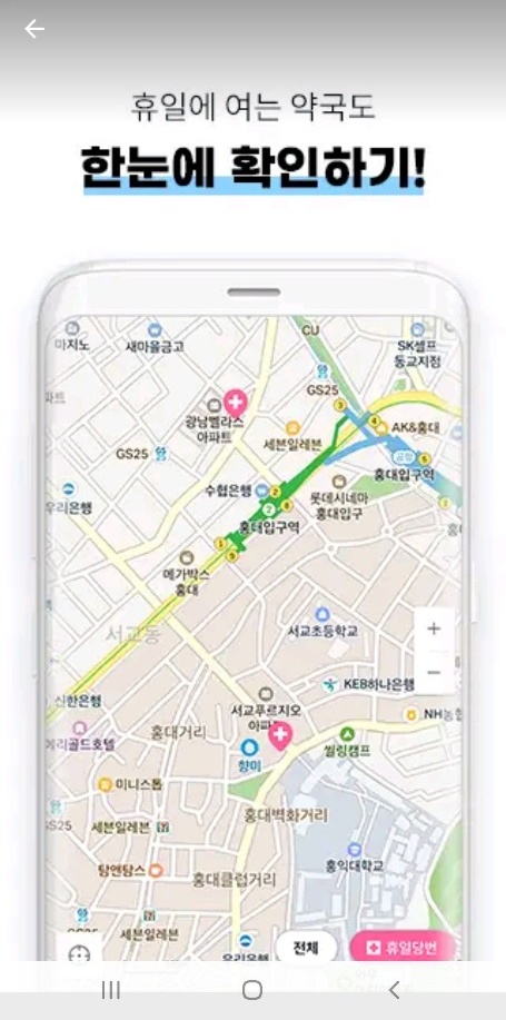 찾아보니 스마트폰 어플로도 약국검색을 할 수있었습니다. 우선 플레이스토어에서 휴일약국을 검색해서 다운로드 받아주시면됩니다. 긴급상황 필수앱이라고 소개하고있는 휴일약국 앱은 주중 주말 휴일 약국을 검색할 수있는 앱입니다. 내주변의 약국을 검색하고 약국의 전화번호까지 제공한다고 하니 검색 후 전화로 바로 확인할 수있겠습니다.