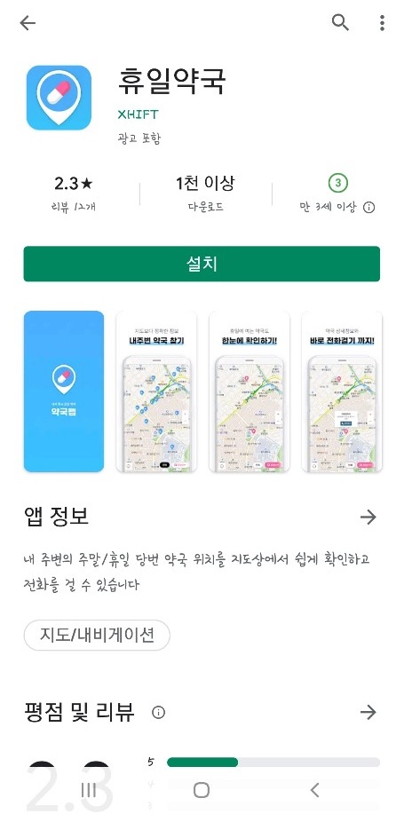 몇명이 다운로드 받지 않았는데도 평점이 낮아서 리뷰를 읽었더니 지도에 약국이 표시안된다는 리뷰가 많았습니다. 하지만 개발자가 일시적인 장애로 현재는 장애의 해결했다고 합니다.