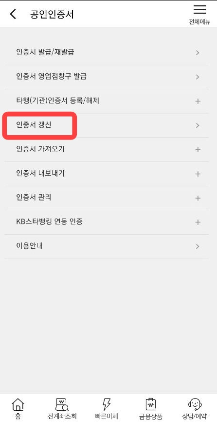 PC를 사용하지 않고 스마트폰을 이용해서 공인인증서 갱신이 가능합니다. 스마트폰 플레이스토어에서 KB스타뱅킹 앱을 설치하시고 전체메뉴키를 눌러 인증센터를 찾아 클릭 해주세요.