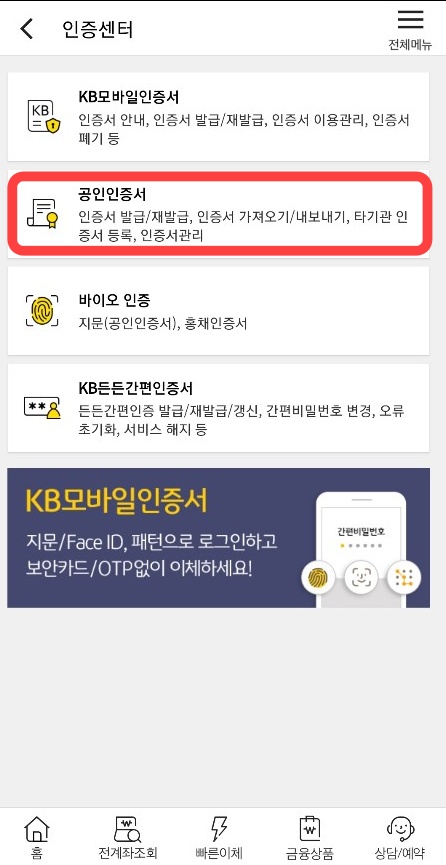 인증센터를 클릭하면 여러가지 메뉴가 나오는데 그중에 두번째에 있는 공인인증서를 클릭해 주시고 인증서갱신을 클릭하여 주신다음 공인인증서 갱신절차를 밟아주시면 됩니다. 저 처럼 타행기관 공인인증서를 쓰시는 분은 해당 은행 앱에서 공인인증서 갱신 후에 타행기관 인증서 등록 버튼을 눌러서 진행해 주시면 됩니다. 여기까지 국민은행 공인인증서 갱신 방법에대해 알아봤습니다.