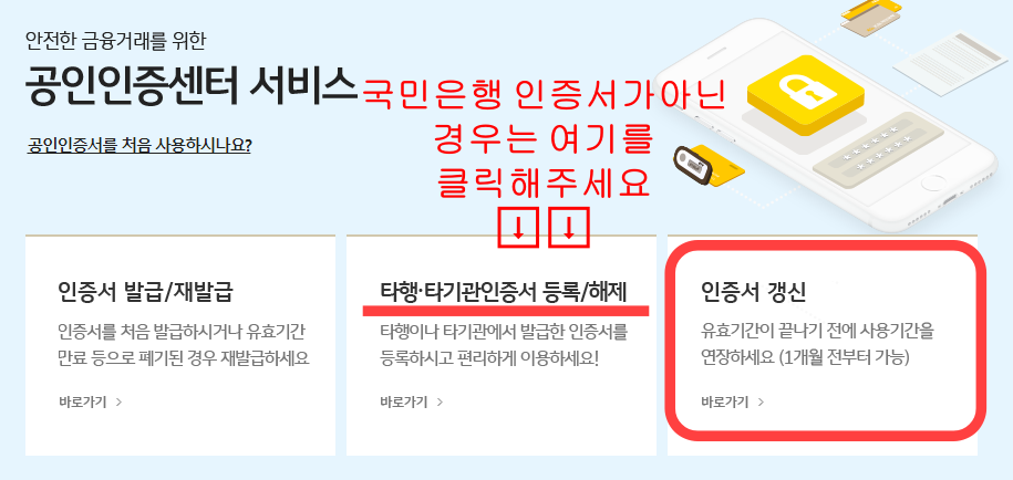 만약 국민은행에서 발급한 공인인증서가 아닌 경우에는 공인인증서를 발급해준 은행 홈페이지로 접속하신 후 그 은행에서 공인인증서 갱신을 하시고 타행기관인증서 등록을 해주셔야 됩니다.