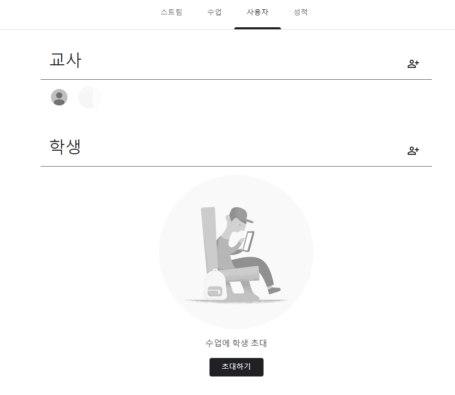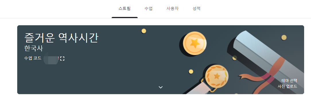 사용자를 클릭하시면 교사를 추가할 수도있고 이메일을 통해 학생들도 초대를 하실 수도있습니다. 학생들이 수업코드를 입력해서 들어오는 방법이 선생님께서 학생들의 이메일을 전부 입력해서 초대하는 방법보다는 쉬울테니 초대코드를 학생들에게 전달하시는 방법을 추천드립니다. 성적버튼은 학생들의 성적을 관리할 수있고 테마로 들어가서 원하는 테마와 사진으로 꾸밀 수도있습니다.