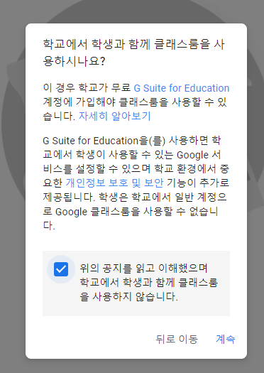 - 교사와 학생은 각자의 G Suit for Education 계정을 사용해 클래스룸에 로그인 할 수있습니다.
