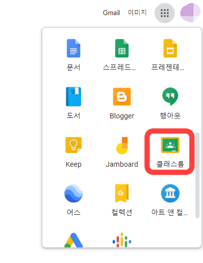 우선 구글 클래스에 들어가는 방법을 설명해 드리겠습니다. 구글클래스는 크롬을 사용하시는 분들이라면 크롬을 켜신 후 오른쪽 위에 메뉴버튼을 눌러보시면 검색 지도 유튜브등이 뜹니다. 그 메뉴에서 아래로 쭉 내리시면 구글 클래스룸이 있습니다.