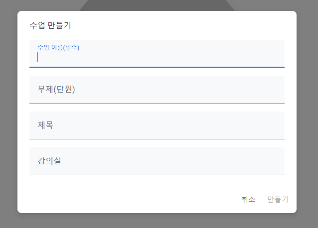 동의를 하고 나시면 수업만들기 창이뜨고 수업이름과 부제(단원), 제목, 강의실 이름을 작성해 주시고 만들기 버튼을 눌러주시면됩니다.