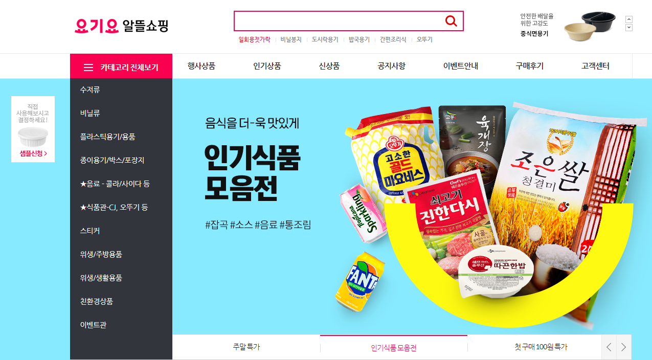 요기요 사장님 사이트에 접속하시면 알뜰쇼핑이라는 메뉴도 있습니다. 장사할때 필요한 식품이나 일회용품등을 판매를 하고있는데 왼쪽에 보면 샘플신청이라는 문구가 작게 보입니다. 클릭하고 들어가시면 일회용품을 100원에 샘플신청을해서 사용해 보실 수있으니 사용해보시고 좋으시면 구매해서 사용하셔도 될 것같습니다.