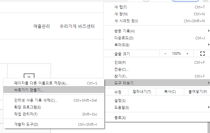크롬에서 요기요 사장님 사이트에 접속 후 오른쪽 상단에 있는 메뉴키를 누른 후 도구더보기를 찾아 누르고 바로가기 만들기를 찾아 누르시면 바로가기를 만들시겠습니까? 라는 문구가 뜹니다. 이 문구에서 만들기를 누르기만 하시면 요기요 사장님 바로가기를 바탕화면에 생성하실 수있습니다.