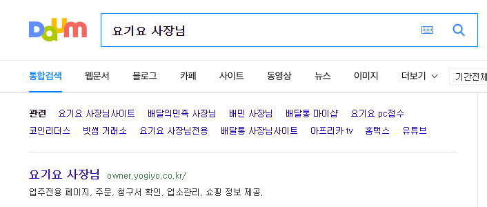 요기요 사장님 사이트 바로가기 첫번째 방법은 인터넷 검색창에 요기요 사장님을 검색하신 후 아래에 뜨는 요기요 사장님을 클릭해주시고 들어가시면 됩니다.