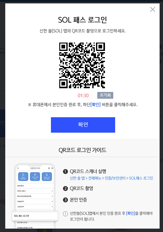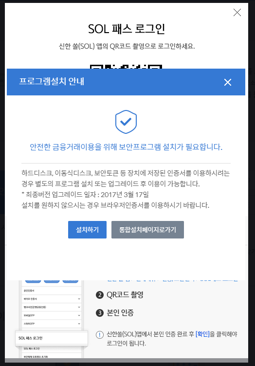 로그인을 하기 위해선 보안프로그램을 꼭 설치해 주셔야 로그인이 가능하시니 보안프로그램을 먼저 다운로드 받아 주시면 되겠습니다. 저는 공인인증서가 타행이라 등록하기가 번거로워 쏠패스 로그인을 이용하여 로그인을 했습니다. 쏠 패스 로그인을 하기 위해선 핸드폰에 신한 쏠앱이 꼭 있어야 됩니다. 신한 쏠앱만 있다면 큐알코드 촬영만으로도 로그인이 가능해서 편리하게 이용할 수있습니다.