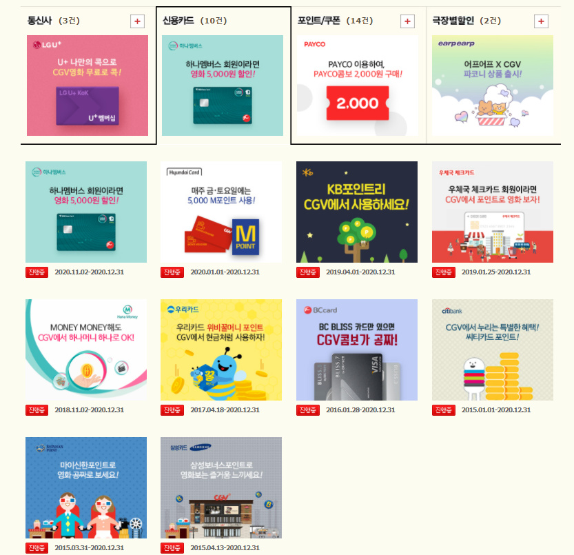 cgv에는 다양한 신용카드 할인과 포인트, 극장별할인, cjone멤버쉽 쿠폰할인과 다양한 할인 이벤트가 준비되어 있습니다. 그 중에서 영화를 많이 보고 cjone등급을 올려 영화를 무료로 볼 수있는 방법도 있지만, 일년에 한번씩 등급이 바뀌기 때문에 시간이 오래걸립니다. 그래서 제가 추천하는 무료로 영화보는 방법은 바로 통신사멤버쉽으로 영화보는 방법입니다.