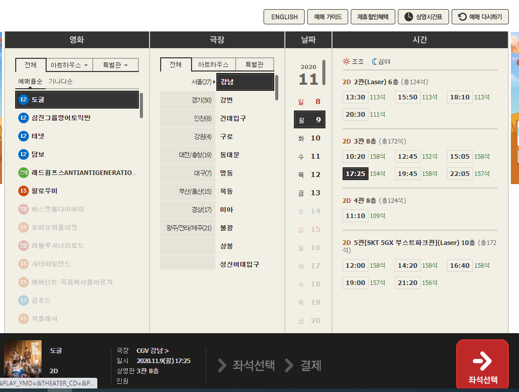 로그인을 완료하시고 좌석선택을 눌러 왼쪽위쪽에 있는 인원선택을 해주시고 좌석을 선택하신 후 오른쪽아래에 결제 선택을 클릭해 주세요. 극장이용시 마스크착용은 필수입니다.