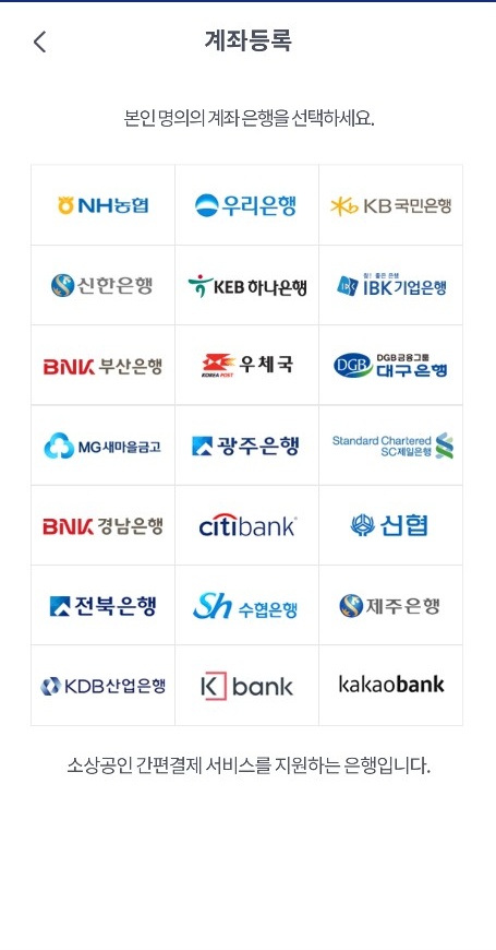 계좌등록을 미리해놓으시면 위에처럼 계좌등록 화면으로 넘어가지 않습니다. 계좌등록을 하기 위해서는 비플제로페이홈화면에서 오른쪽하단에 더보기를 클릭하신 후 상단에 설정을 누르면 계좌관리가 나옵니다. 계좌관리에서 계좌등록을 해주시면 됩니다.