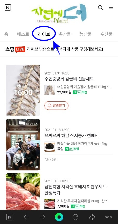 스마트폰 네이버앱이나 인터넷을 통해 검색창에 자연에더를 검색해 주시고 아래쪽으로 조금 내려 자연에더 홈페이지에 접속해 주시면 자연에더 홈페이지 메인 화면이 나옵니다. 상단에 가운데에 있는 라이브를 클릭하셔서 현재 하고있는 라이브 쇼핑을 확인하시고 구매하시면 됩니다. 라이브가 아니더라고 베스트를 누르셔서 원하는 상품이 있나 확인해 보시고 구매하셔도 좋을 것같습니다.