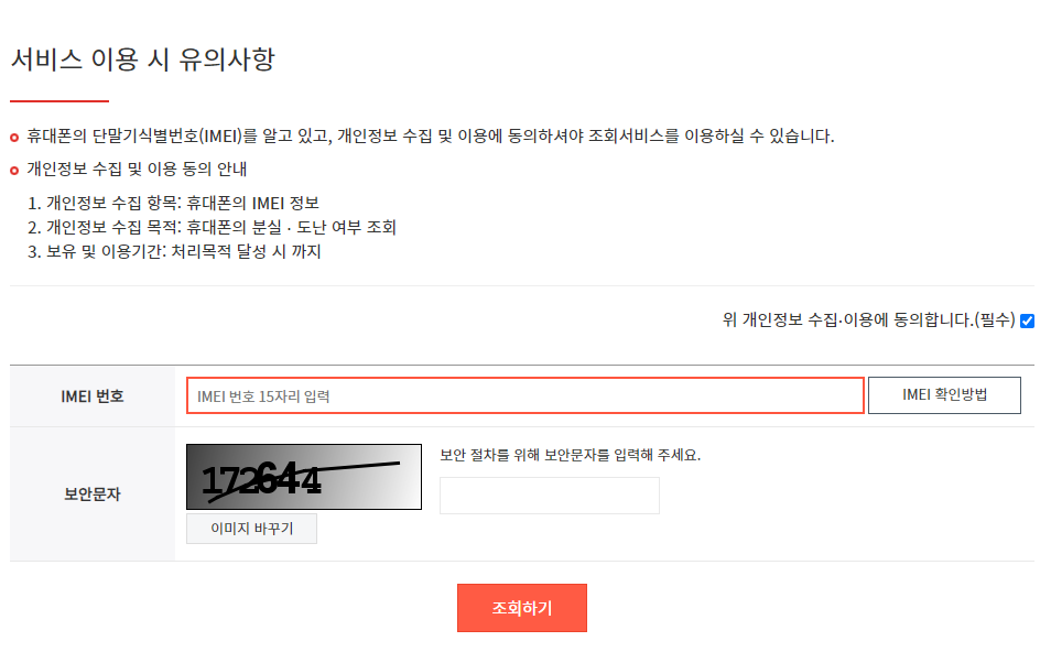 메인화면 상단 오른쪽 끝에 보이는 요금할임 조회를 클릭해 주시고 요금할인(선택약정) 대상 단말기 조회를 눌러 주세요. 그럼 위쪽에 단말기교유식별번호 조회하기 라고하면서 25% 요금할인 적용은 이동통신 3사만 가입 가능하다는 안내사항이 나오고 분실/도난 무료조회 아래에 서비스 이용시 유의사항도 나옵니다. 더 아래로 내려주세요.