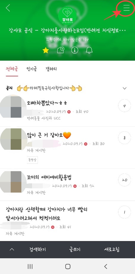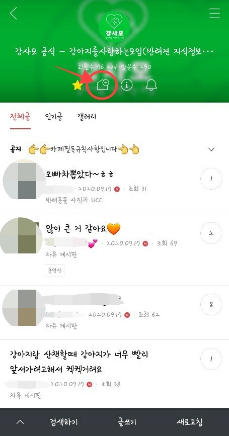 이렇게 애정하는 카페의 바로가기를 원하는 곳에 추가를 했으면 이제 중요한 공지를 바빠서 확인 못하거나 하는 일이 없게 원하는 글에 알림을 설정해 볼까요? 다음카페 어플을 이용하거나 바로가기 설정을 해둔 알림설정을 원하는 카페에 접속해 줍니다.