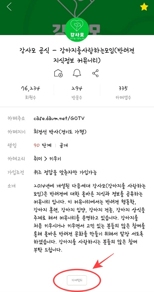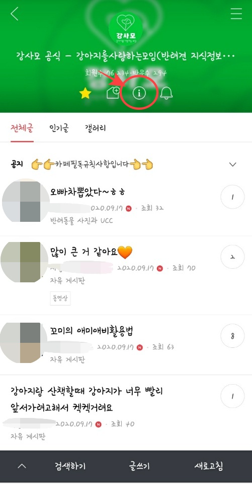 마지막으로 잘못 가입한 카페나 아~주 어릴때 가입해 둬서 더이상은 들어가지 않는 카페가 있는경우를 위해 다음카페 탈퇴 방법을 알아보겠습니다. 탈퇴를 원하는 카페 상단에 있는 ⓘ 버튼을 눌러주면 카페의 정보가 뜨는데요. 정보 맨 아래 쪽에 보면 아주 작은 글씨로 카페탈퇴 버튼이있습니다.