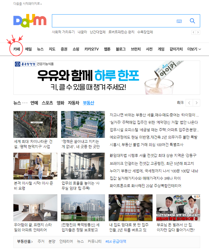 우선, 인터넷에 다음을 검색하고 다음으로 접속해 주세요. 그리고 좌측 상단(화살표시)에 카페를 클릭해 주시면 다음카페에 바로 접속이됩니다. 아주 귀여운 니니즈들이 다음카페 첫화면에서 반겨주고있네요.