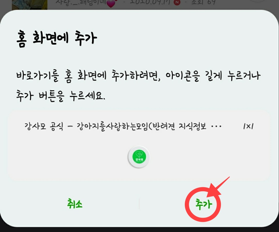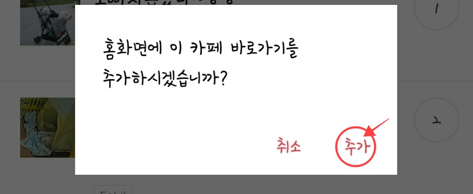 우선 바로가기를 할 카페에 들어가 줍니다. 카페에 홈화면에 위쪽에 집모양(화살표)을 클릭해줍니다! 추가 하시겠습니까? 문구가 뜨면 추가 버튼을 두번 눌러 주면 핸드폰 홈 화면에 추가가 완료됩니다.