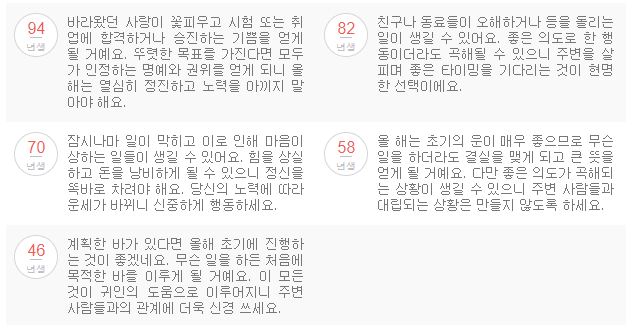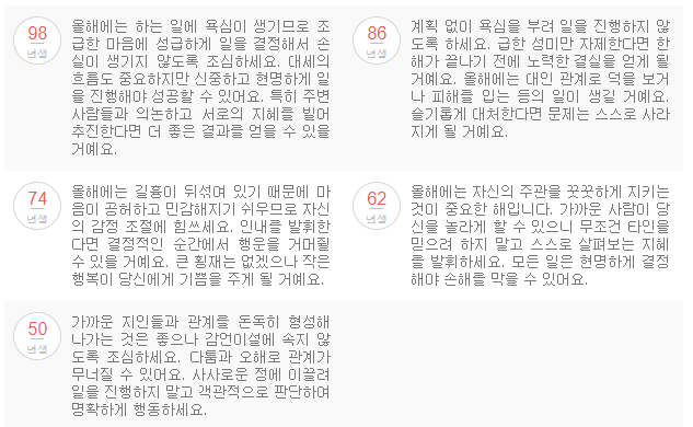 올해에는 모든일에 때가 있음을 알고 조급함을 버려야 됩니다. 철저하게 준비하면 자신의 능력을 펼칠 수있고 감정적으로 행동하기 보다는 냉철한 판단으로 지혜를 발휘해 일을 진행해 나가면 소망해 왔던 일에서 좋은 성과를 얻을 수있다고 합니다.