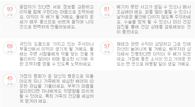 올해는 밝은 앞날이 확실히 보이고 있으니 기쁜 일들이 생기게 됩니다. 잘 풀리지 않는 일이 있더라도 차근차근 진행해 나간다면 실마리가 풀리게 되므로 꾸준히 준비하는 마음으로 일을 진행하면 좋습니다.