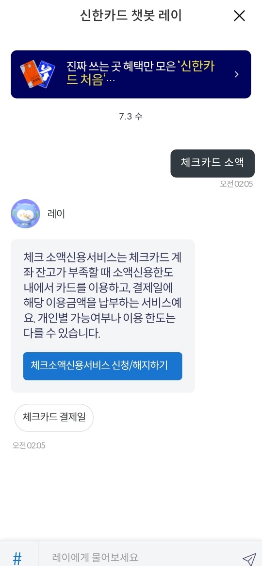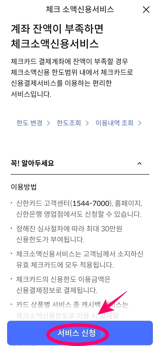 제가 발급받은 신한카드를 예로 들어 들이면 신한카드앱으로 들어가신 후 신한카드 챗봇이나 돋보기에 체크카드 소액이라고 검색하시면 체크 소액신용 서비스가 나옵니다. 체크 신용카드 서비스를 신청하시고 다시 삼성페이에 카드 등록을 하시면 삼성 휴대폰으로도 간편하게 교통카드 기능을 사용하실 수있습니다.