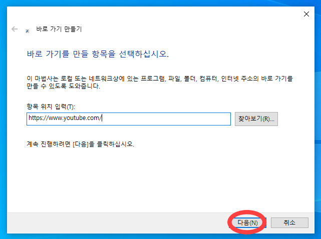 새로만들기 -> 바로가기 -> 바로가기주소입력 -> 이름설정 -> 마침