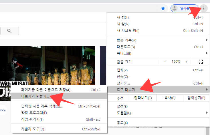 메뉴버튼클릭 -> 도구더보기클릭 -> 바로가기만들기클릭 -> 만들기완료