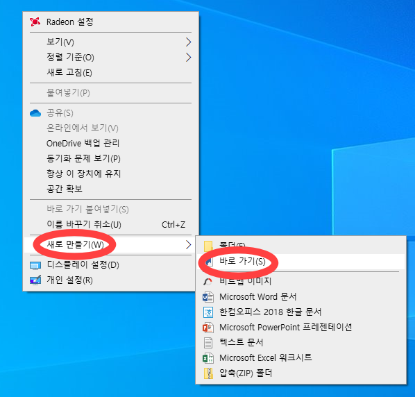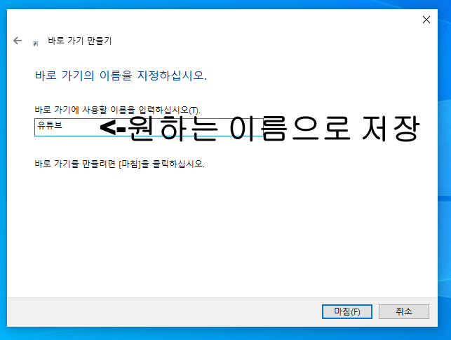 새로만들기 -> 바로가기 -> 바로가기주소입력 -> 이름설정 -> 마침