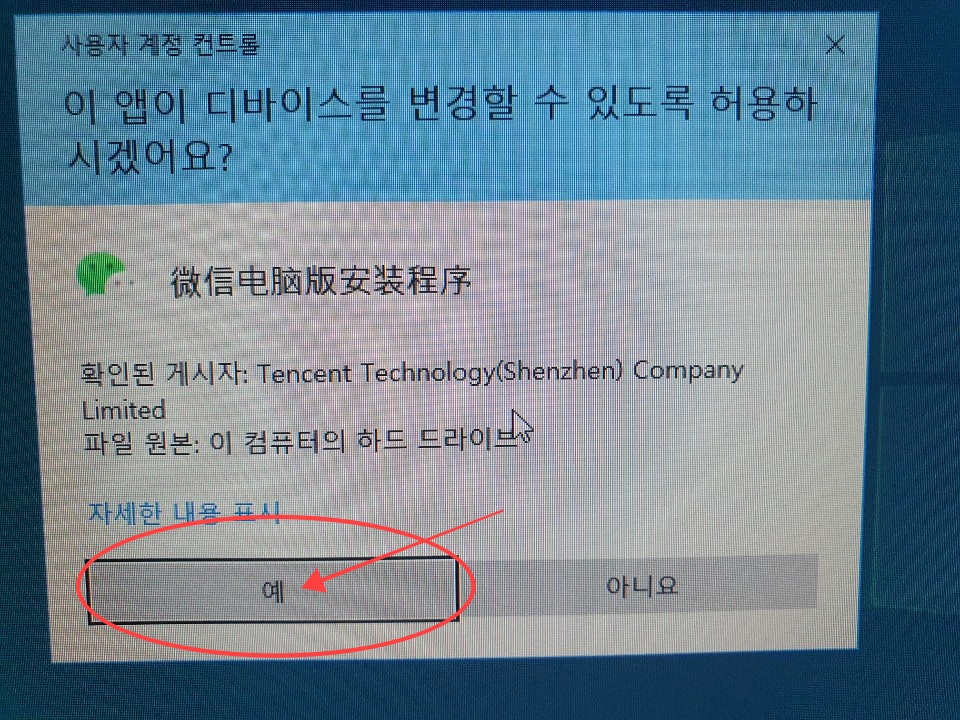 다운로드가 완료되면 초록색 버튼(빨간화살표)을 한번더 눌러 주시면 설치가 시작됩니다. 설치가 완료되면 Run이라는 문구를 클릭하고 클릭하면 위챗은 125%로 확대설정 시 취소 가능 하며, 일반 – PC 디스플레이 스케일링 적용이라는 문구의 OK버튼을 클릭해주세요.