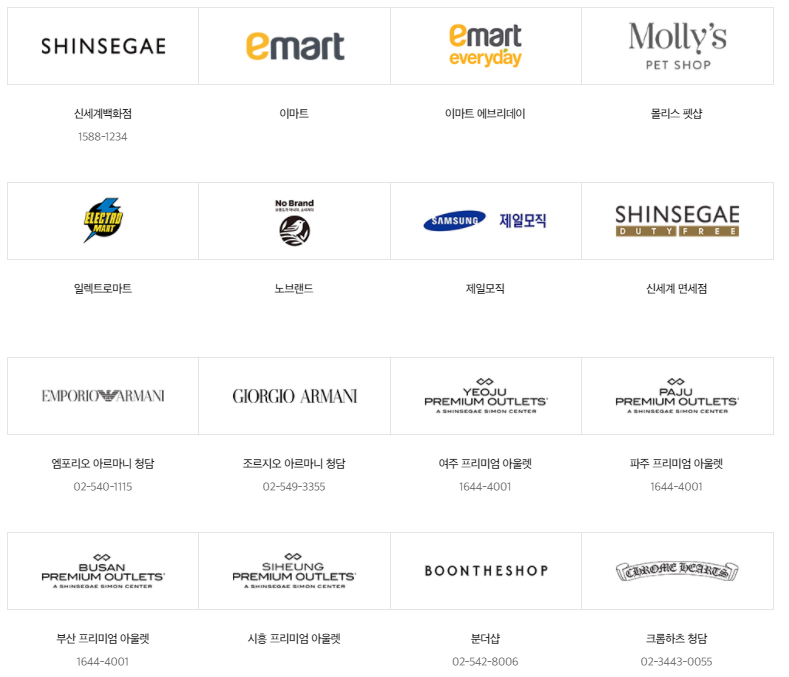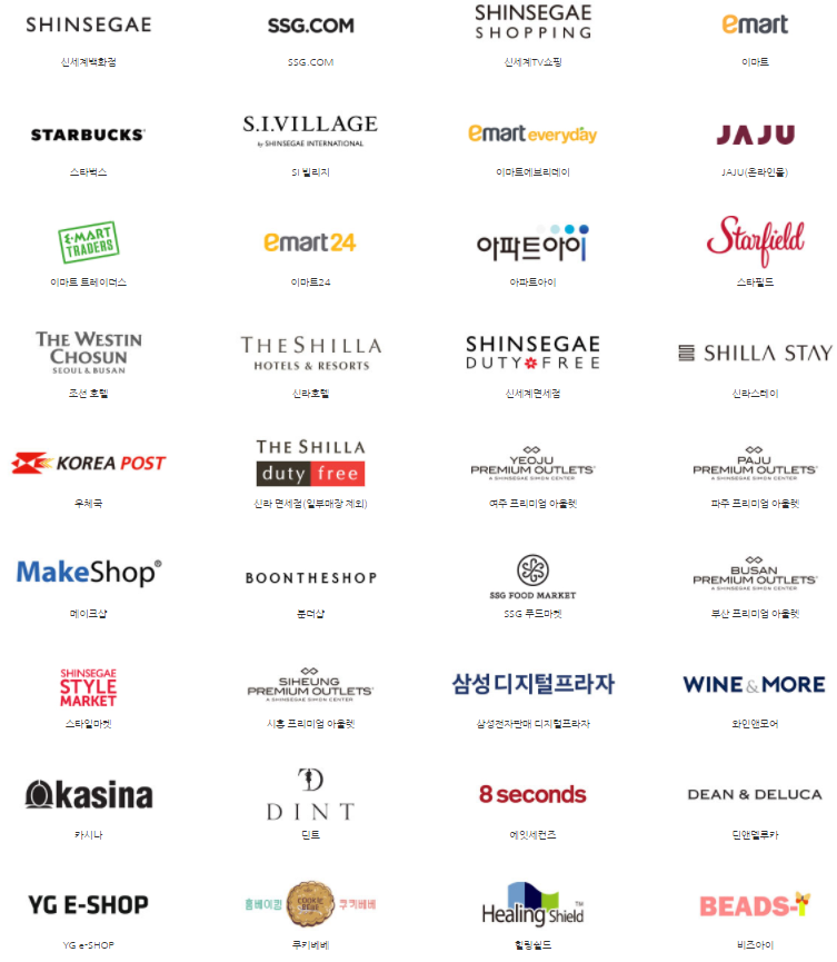 우선, 쇼핑으로는 신세계백화점 전지점과 이마트, 노브랜드, 정관장, 몰리스 펫샵등에서 사용이 가능합니다.