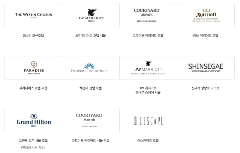다음 호텔로는 웨스틴 조선호텔, JW메리어트 호텔 서울, 해운대 센텀호텔, 그랜드 힐튼 서울 호텔등 에서 사용 가능 합니다.