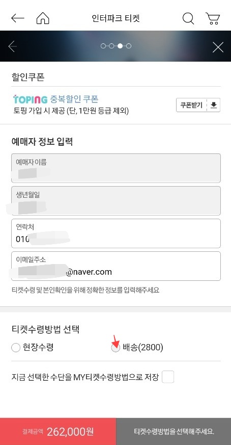 가격선택을 하고나면 현장수령이나 배송으로 티켓수령방법을 선택할 수있습니다. 배송은 약간의 배송비가 포함되네요. 배송아래의 티켓프리미엄서비스는 선물할때 좋을거 같은 서비스 입니다. 수령방법 선택후 예약자 확인란의 이름과 생년월일 연락처와 이메일을 꼼꼼히 확인한 후 다음단계를 눌러주시면 됩니다.