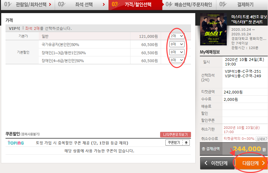 좌석선택을 완료하면 티켓의 가격을 선택할 수있게나옵니다. 국가유공자나 장애인분들은 할인된 가격에 예매를 하실 수있습니다. 저는 해당되는게 없어서 일반2매를 선택하고 다음단계를 눌렀습니다.