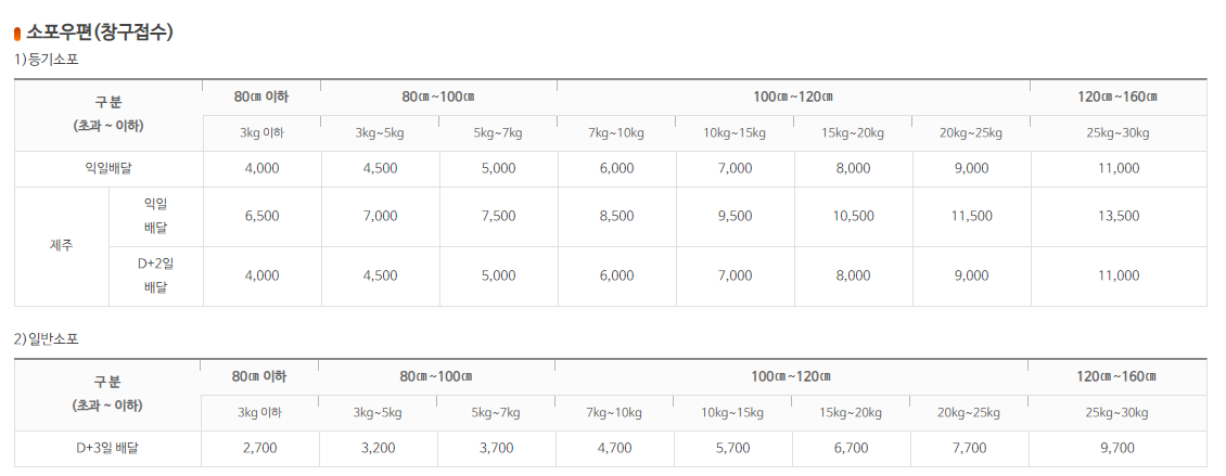 우체국택배 이용시 우체국직원이 방문하는 방문접수는 5kg이하부터 30kg까지 4000원부터 14500원에 이용할 수있네요. 창구접수는 3kg이하부터 30kg 까지 일반소포는 2700원부터 등기소포는 4000원부터 13500원에 이용 할 수있네요.