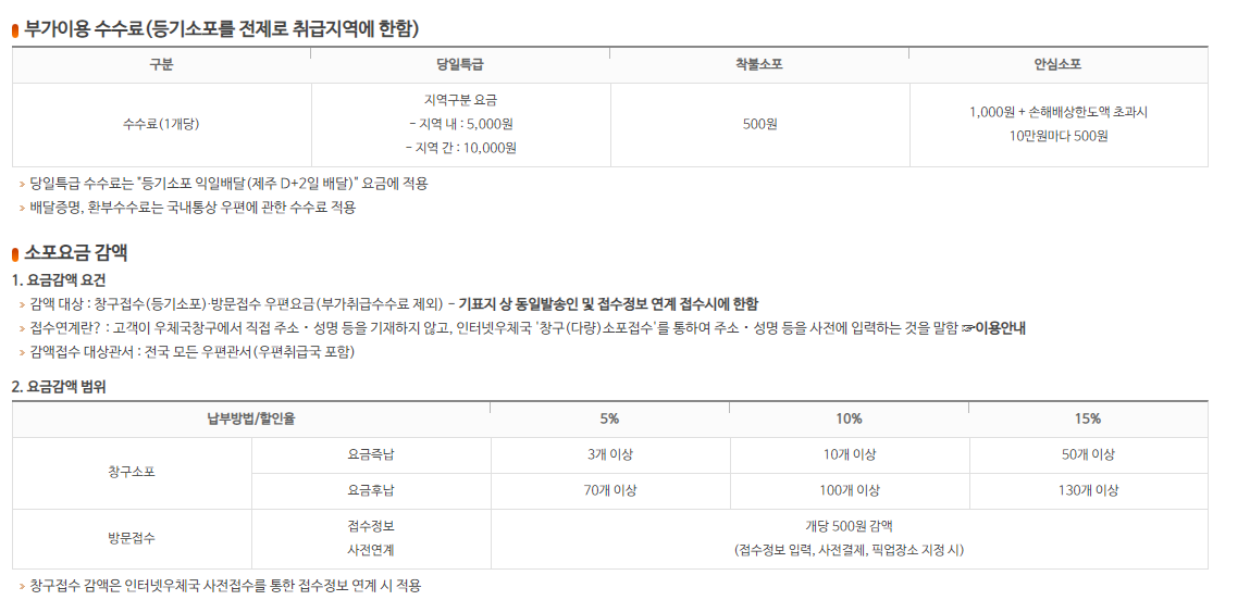 - 당일특급 우편물의 경우 중량은 20kg이하이며, 크기는 120cm이내에 한하여 취급합니다.