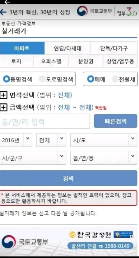 아직 어느 아파트를 가야할지 고민을 하고 계신분이라면 면적이나 금액선택등으로 아파트 실거래가 조회가 가능하며, 내가 원하는 아파트가 있으신 분은 아파트의 주소를 입력해서 검색하실 수도있습니다.