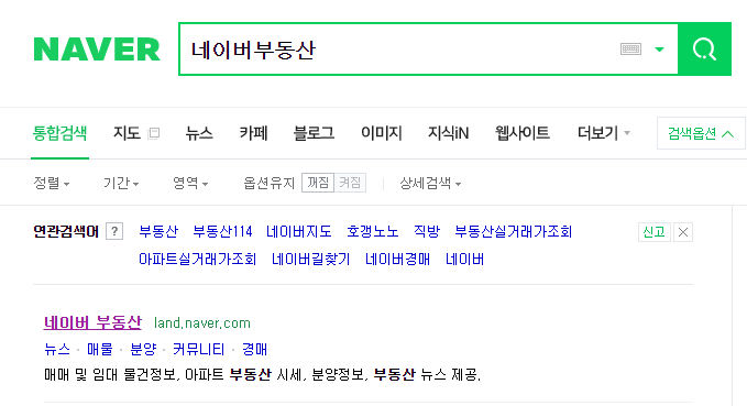 다음으로 아파트 실거래가 조회하는 방법은 네이버부동산을 이용하는 방법입니다. 인터넷 검색창에 네이버부동산을 검색하여 주시고 네이버부동산사이트에 접속해주세요.