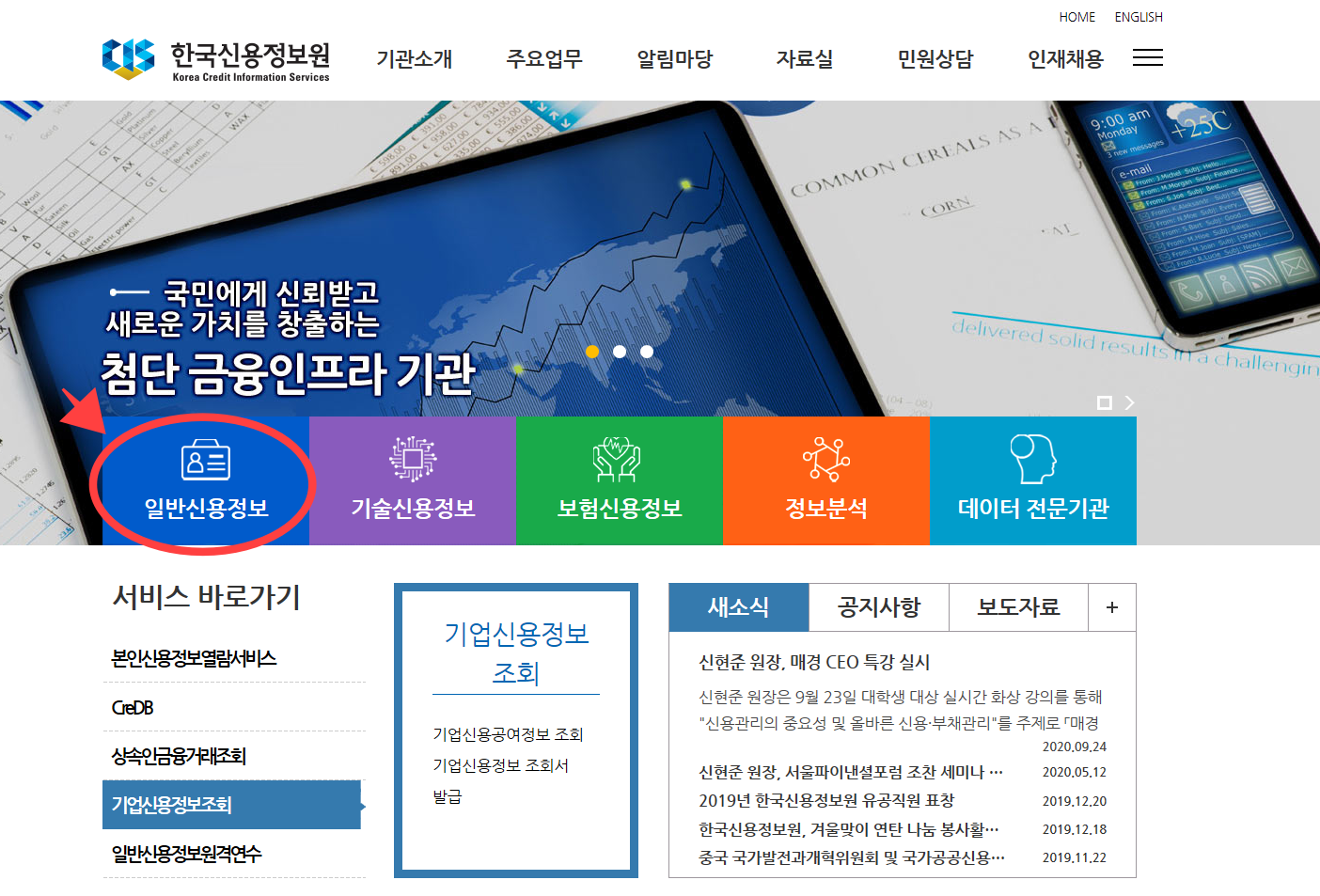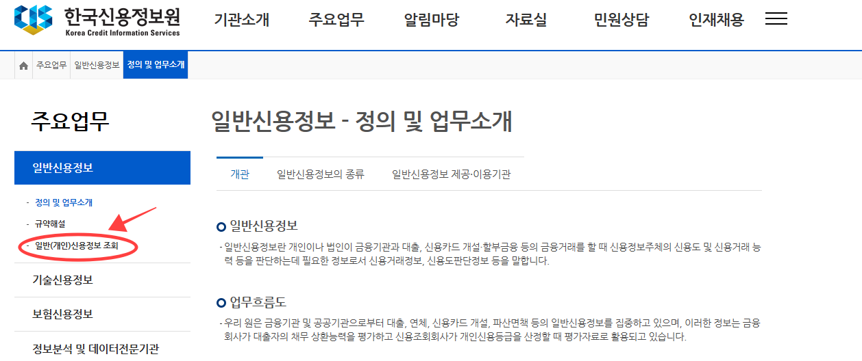 우선 인터넷 검색창에 한국신용정보원을 검색하고 홈페이지에 접속한 후 홈페이지 첫페이지 중간에 나오는 일반신용정보를 클릭해 주면 일반신용정보 정의 및 업무소개가 나오는데 이때 왼쪽의 메뉴에 있는 일반(개인)신용정보 조회를 클릭해주면 아래쪽에 크레딧포유로 접속할 수있는 팝업을 누르고 크레딧포유로 접속해 주시면됩니다.