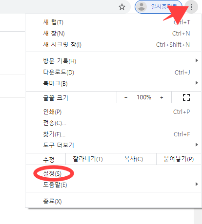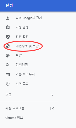 우선 요즘 많이들 사용하고 있는거 같은 크롬 쿠키삭제방법을 알아봤습니다. 우선 크롬을 실행시켜주고 오른쪽위에 메뉴버튼(점점점)을 눌러준뒤 설정을 누르고 설정창으로 넘어가면 왼쪽에 개인정보및보안을 눌러주세요.