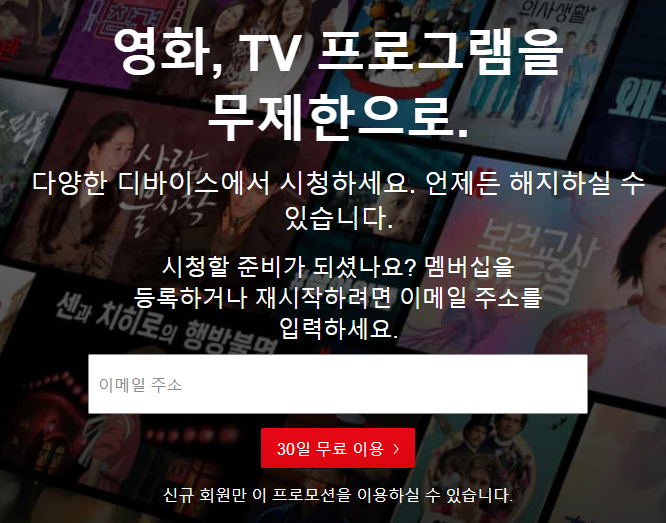 넷플릭스는 신규회원에게 무려 30일동안 무료로 이용할 수있는 프로모션을 진행하고있는데요. 무료로 이용하기 위해 가입하면 가입절차에 결제정보를 등록하게 되어서 30일이 지나면 계좌에서 돈이 자동으로 빠져나가게 됩니다. 30일 무료체험을 다 하시고 더이상 보고싶지 않다고 하시는 분은 언제든지 해지가 가능하니 바로해지를 해주시면됩니다.
