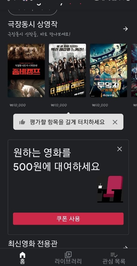 쿠폰사용을 누르시면 만료기간이 뜨고 둘러보기를 누르시면 구글영화가 뜹니다. 원하시는 영화를 선택하셔서 대여하기를 누르시면 단돈500원에 대여를 하실 수있습니다.